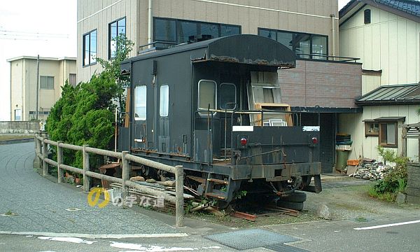橋の傍らの民家の庭に置かれたヨ8000。この時点で外板の腐食が進んでいる。2008年3月訪問時には一層腐食が進行していたもののまだ存在していたが、2014年9月には撤去されていた。