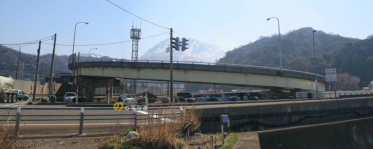 青海川跨線橋空撮。青海川河床に橋脚が立てられている。まことしやかに噂される阪神電鉄武庫川駅のような固定資産税対策か?(※)と思えるが、県道は非課税だから単純に「用地買収しようにも土地がない」という事情だろう。国交省河川局との調整は県が担当したのだろうか。