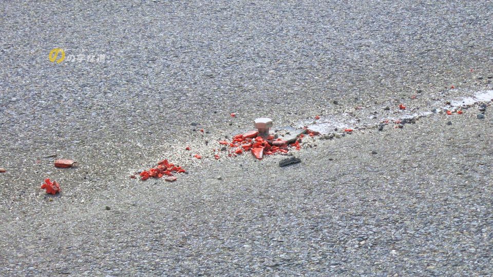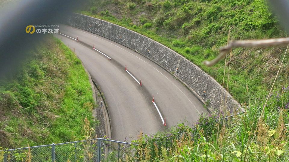 のの字区間は中央線にポールコーン(いわゆる人参)が埋め込まれ、センターラインを越えるような走行を防止する意図は感じられるのだが、踏み潰された箇所がいくつかあった。快走できる場所だからなのか、或いは幅員が狭い(というより、想定以上の車幅の車両が通行している)からなのか。