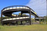 昇降階段を上から眺める。螺旋階段橋脚は他の螺旋階段式歩道橋よりも細いものが使われている。両側に取り付けられたさらに細い軸?管?は、おそらく内照式道路標識用の電源ケーブルを格納しているのだろう。