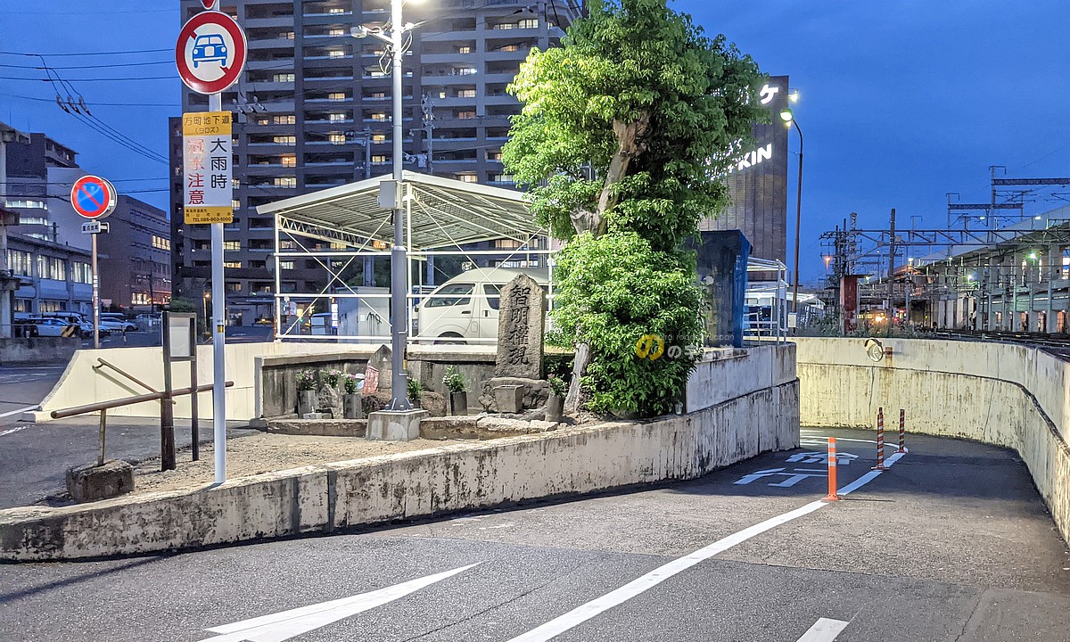 ループしているのは二輪車用道路だけで、歩道は左に階段がある。万町地下道ループの中央には智明権現の碑がある。万町地下道東口の付近には岡山城下の町門があったそうなので、西国へ出立する人たちの安全を願う道祖神のようなものか?1891(明治24)年の山陽鉄道敷設・開業によってこの地に遷座されたのだろうか。