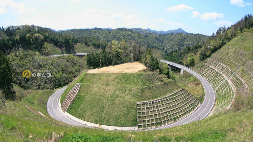 のの字部は大規模な掘割と橋で構成されており、巨額が投じられたことが容易に想像できる。その一方、通行量はそこそこ(10分に1台程度の割合)あり、農道としての受益度は不明ではあるものの活用されていると見てよさそうだ。