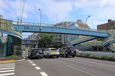 小田急小田原線千歳船橋駅近く、環八通りに架かる歩道橋の両端昇降階段がループしている。正確にはループしているとは言えないかも知れないが、ループしているように見える。立体横断施設設置要領案(1967年)や横断歩道橋便覧(1969年)が整備されて...