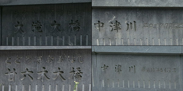 一般的な橋名板は橋の両端両側に取り付けられるが、ここは片方だけ。廿六木大橋は橋の下側、大滝大橋は橋の上側に取り付けられている。