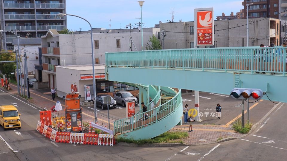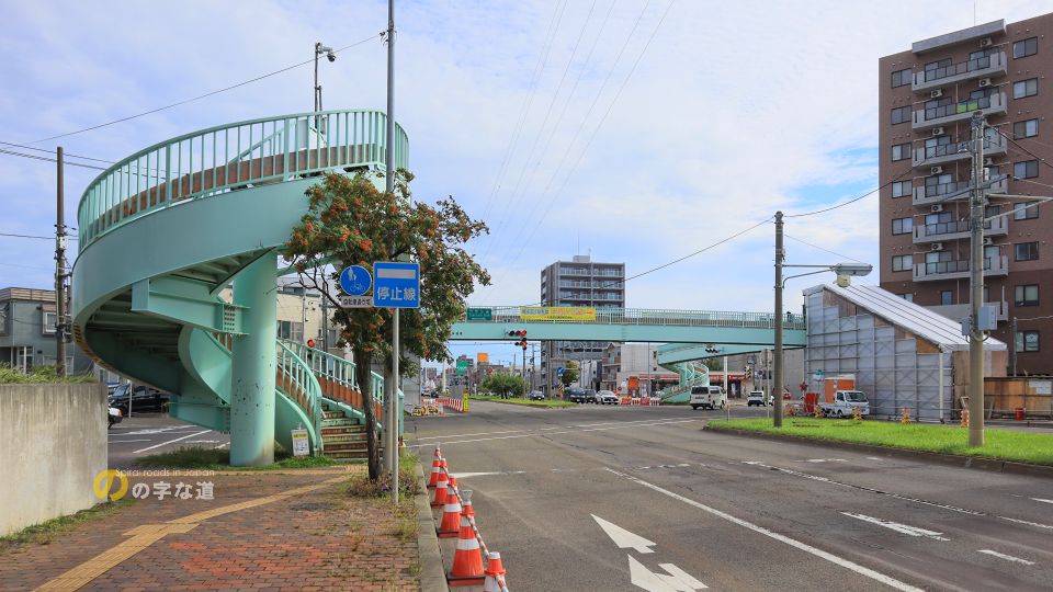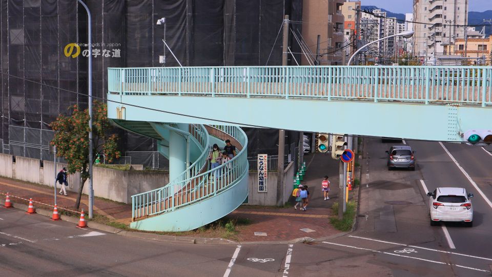 豊平区役所近く、環状通と白石中の島通の交差点に架けられた横断歩道橋の昇降階段4基のうち2基がループしている。