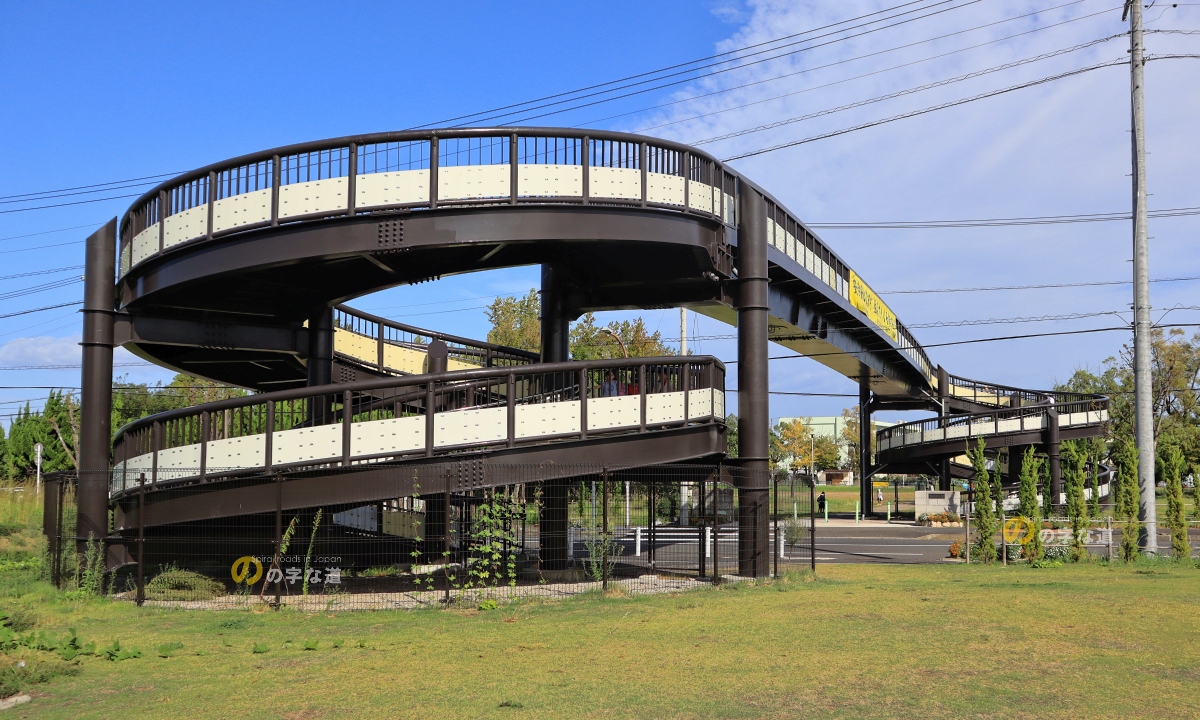 江戸橋横断歩道橋が架かっていた国道23号の幅員は26m、移設先の市道笹川環状1号線の幅員は21.2mで、螺旋階段部を公園内に置くことを考えればジャストサイズだ。ただ、道路法の制約があった。螺旋階段部を公園内に置くのでは無償で譲り受けられないので、四日市市は昇降階段の範囲を公園区域から道路区域に変更したとのこと。