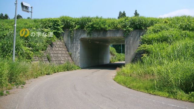 で、現地に到達すると、正面にボックスカルバートが見える。その手前200mぐらいの左側に、かろうじて判別できる旧道が見えた。もちろん、移動式ペーブフェンスでがっちり閉鎖されているうえ、草ぼうぼうのため、足を踏み入れることは困難だ。