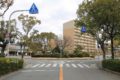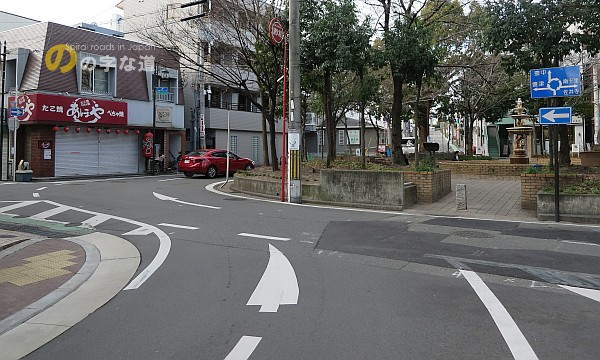 北側から。全ての流入路は警戒標識「ロータリーあり(201の2)」は設置されていないものの、一時停止で規制されている。建物が敷地いっぱいに建てられていて交差点の見通しが悪いので妥当だろう。