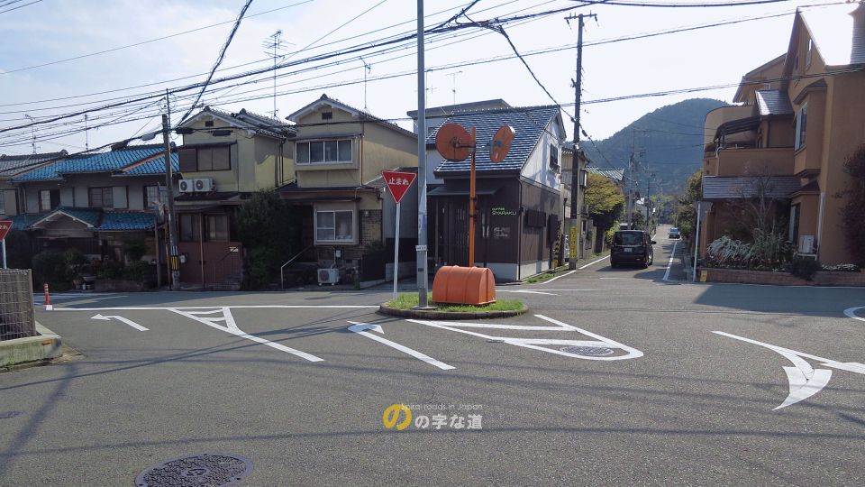 南東側から眺める釈迦谷口交差点。信号制御ではない。