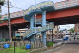 歩道橋本体の橋桁に翼みたいなものがついてるのはなんでだ?と思って追いかけてみると、なんと昇降階段と斜路は歩道橋本体に吊り下げられていたのだ。そんな構造は初めて見たぞ。
