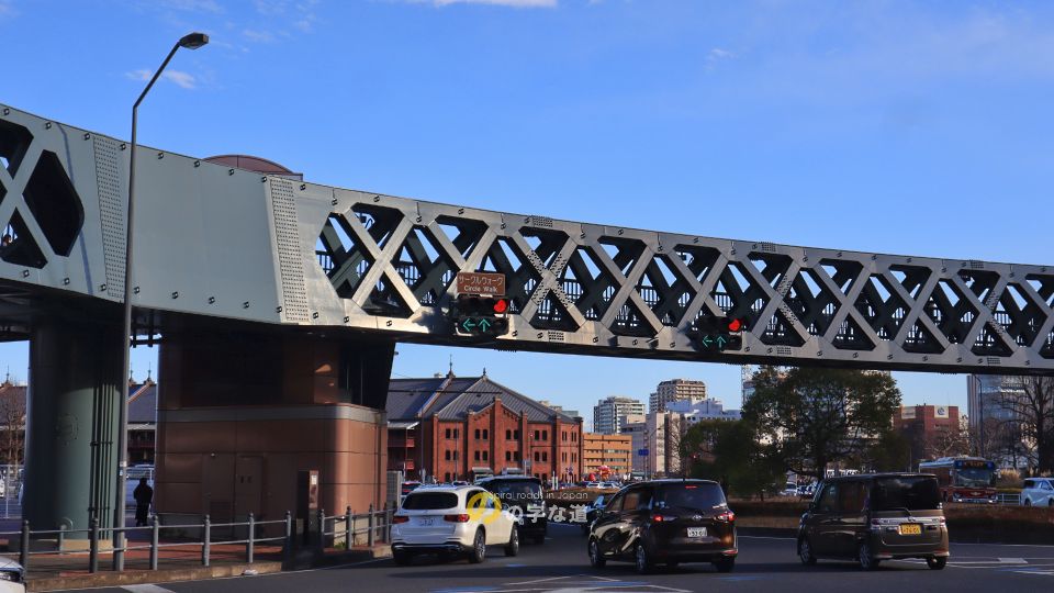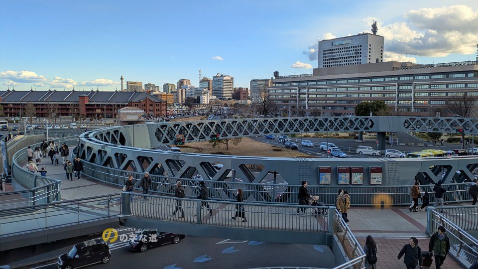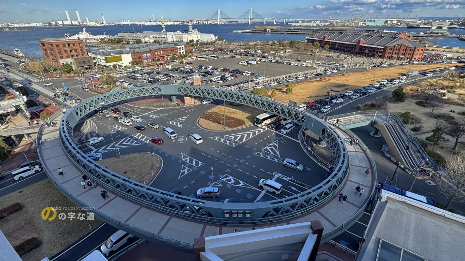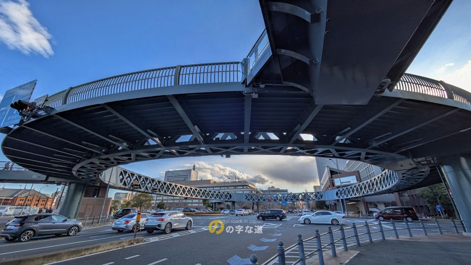 横浜新港埠頭、横浜ワールドポーターズ前の交差点に円形歩道橋が架けられている。