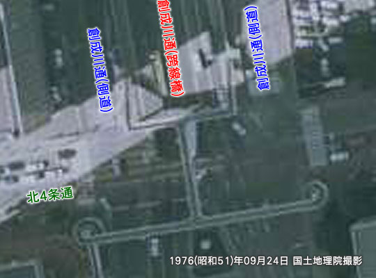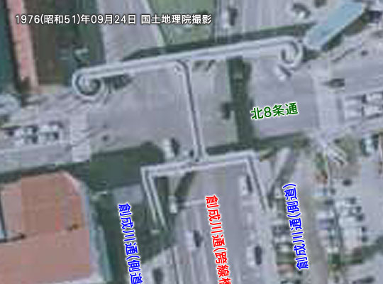 北8条と北3条の歩道橋の中央付近にそれぞれ設けられている踊り場らしき箇所は、北5条付近のJRの線路が、高架ではなく跨線橋にて越えていた時代に、その跨線橋に直接渡ることが出来る構造になっていました。現在は跨線橋が無くなったためその役目を終えましたが、1970年代当時の航空写真などには、H型の歩道橋として写っています。つまりここは、その先に伸びていた歩道橋の跡になる訳です。