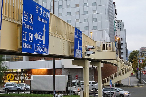 札幌の都市開発において南北方向の基線となった道路が創成川通である。江戸時代、幕府の役人であった大友亀太郎が指揮して開鑿した「大友堀」が、1874(明治7)年に「創成川」に改名された経緯を持つ。その創成川通には横断歩道が設けられているものの、基幹道路であるが故か待ち時間が長く、急ぐ人のために横断歩道橋を架けたのだろう。札幌市内区間の架橋は5件で、そのうちの3件は階段がループしている。しかも、自転車等の利用を想定していない階段式だ。