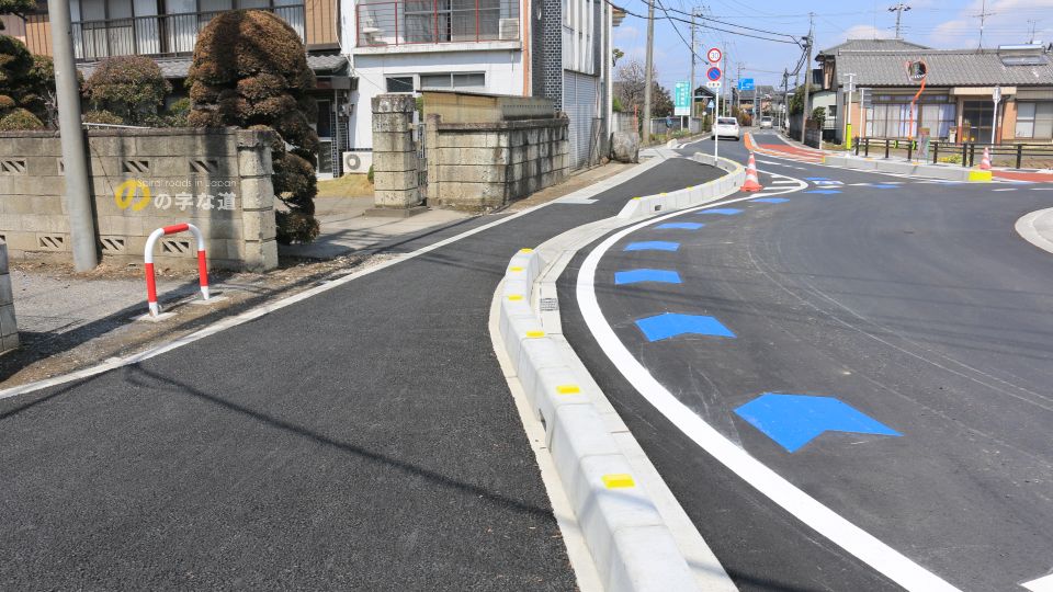 古くからの畦道と民家の出入口が環道に面している。ラウンドアバウト化を機に畦道にはボラードを立てて自動車を通行できなくしているが、民家は如何ともしがたい。