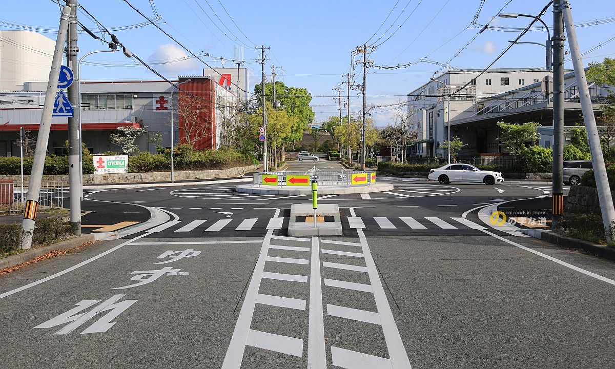 須磨区の内陸部、E28神戸淡路鳴門自動車道の布施畑ICに隣接する神戸流通センター内の交差点(1985(昭和60)年頃に完成・供用開始)が信号制御からラウンドアバウトに変更された。なんでここをラウンドアバウトに?という場所だが、布施畑ICから神戸総合運動公園(ユニバー記念競技場)へ向かう車の大多数が通過する交差点で、流通センター内を通行する貨物車も多いことから、交通流を円滑にしようということだろう。