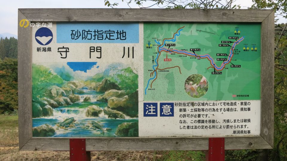 守門岳北面から北上して旧下田村内で五十嵐川に合流する守門川では新潟県による火山砂防事業が行われており、五十嵐川に合流するまでの区間に計8基の砂防堰堤が設けられて(うち1基は建設中)いて、最下流の堰堤に設けられている魚道がループしている。