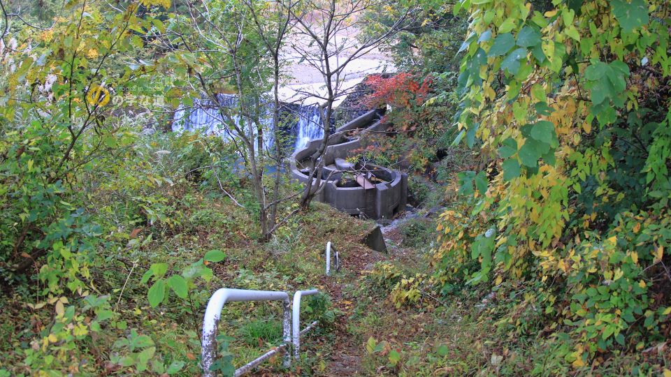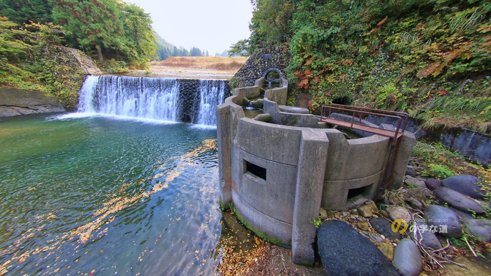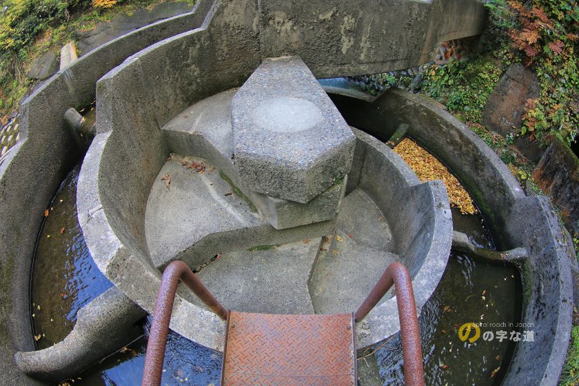 その第二号堰堤は1953(昭和28)年11月竣工。砂防施設としては新しい(少なくとも、古くない)部類だ。設置されている魚道は1987(昭和62)年竣工。古城のような印象を持つ「らせん型」である。