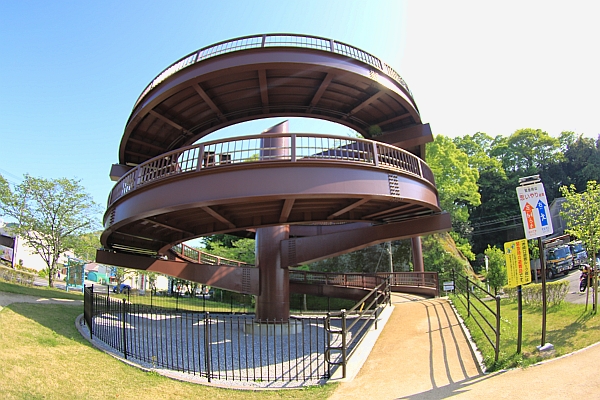 道路面からスロープで2回転して公園までつながっている歩道橋であるが、公園に入った途端に階段がある。これじゃ車いすの避難はおぼつかない。ということは当然市役所も把握していて、「車いす利用者などの避難誘導、ループ橋の終点となっている平地部分や階段の整備については、今後の検討課題」とされている。