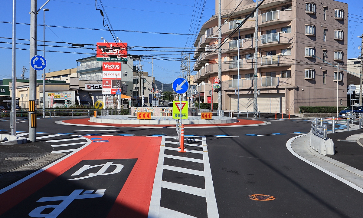 大薮町ラウンドアバウトに続いて市内2件目のラウンドアバウト。こちらのラウンドアバウトは供用開始から既に3ヶ月以上経過していたが、環道上で一時停止して進入車に進路を譲る車、進入時に減速しすぎて何度もエンジン停止する車、豪快に逆走する自転車等、まだ通行に慣れない人が多いようだ。地道な指導が必要だろう。