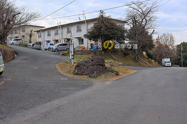 大倉団地内ロータリーを南側から眺める。明らかにロータリー交差点ではない。円形交差点とも言い難く、単なる交通島だ。