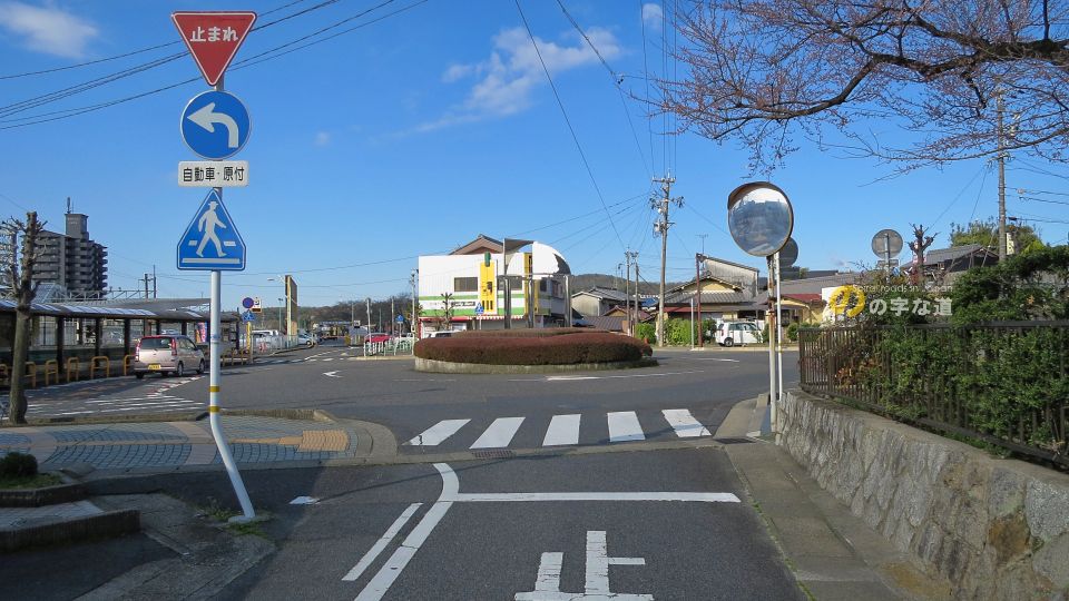 ロータリーを歩行者が横断できるようになっておらずタクシー待機場もないが、駅前なのでバス停があり、送迎の自家用車が短時間ではあるが滞留する。また、接続する道路5本のうち4本は環道合流の際に一時停止の必要はない。