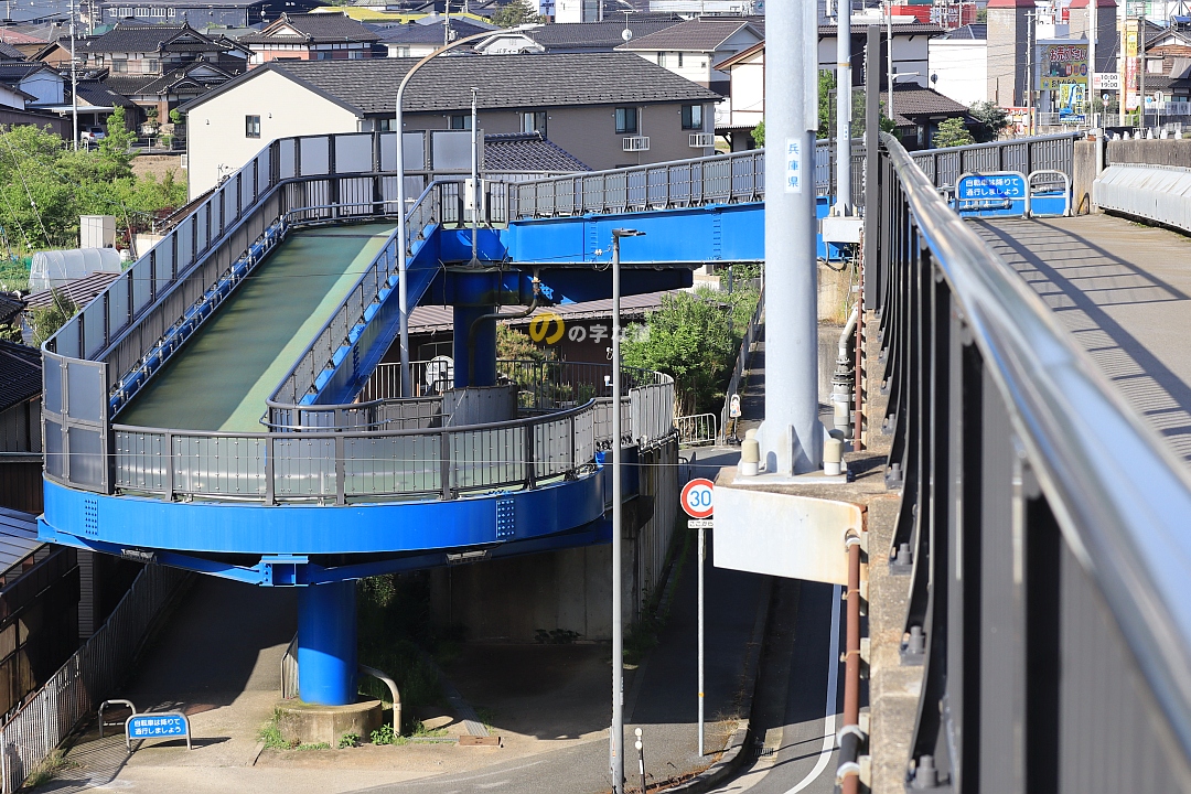 豊岡大橋自歩道橋右岸側斜路を下から眺める。右岸側の堤防は裏法面勾配が緩いことにより、ループの回転数が左岸よりも少ない。
