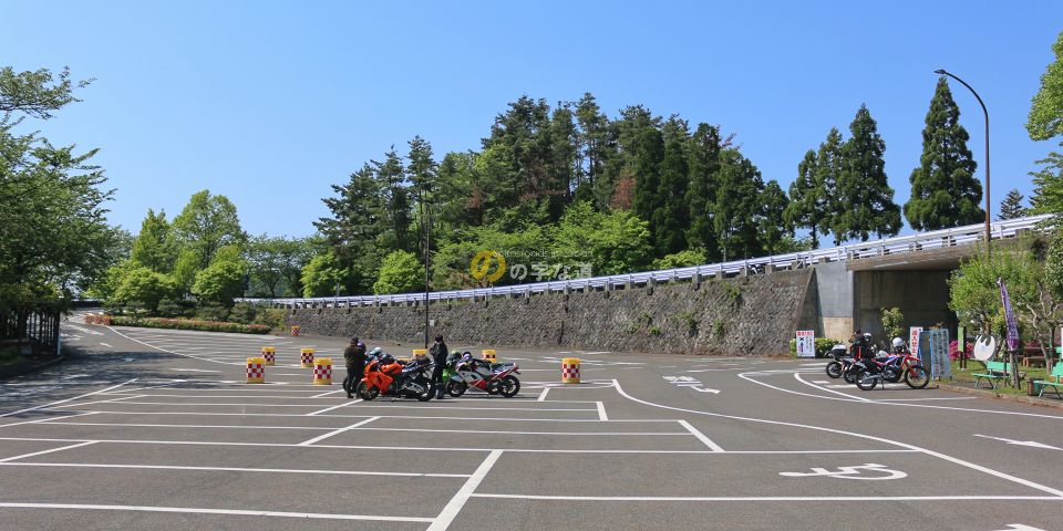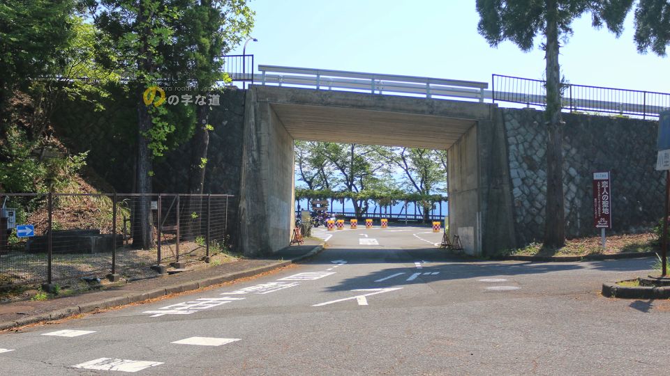 奥琵琶湖パークウェイ・葛籠尾崎駐車場全景。写真右のカルバートのようなところをくぐって駐車場に入ってくる。駐車場を出て月出方面へ向かうとそのカルバートのような上を走る。