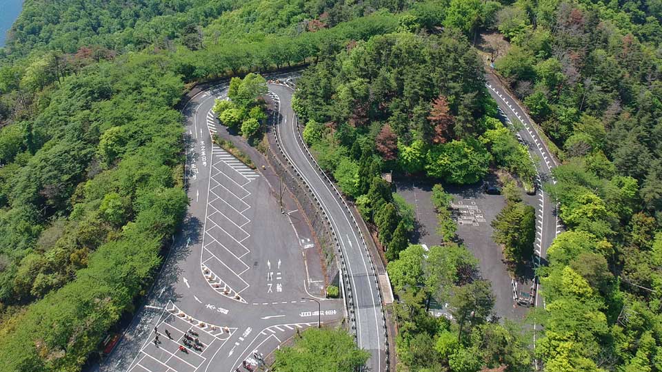 1971(昭和46)年9月29日に開通・供用開始し、1989(平成元)年まで有料道路だった奥琵琶湖パークウェイの最奥部・葛籠尾崎駐車場と県道の交差がのの字状になっている。