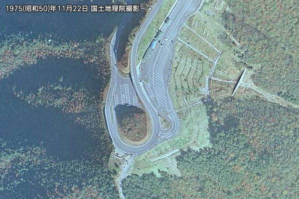 1975(昭和50)年11月22日 国土地理院撮影の空中写真。県道512号葛籠尾崎塩津線は一方通行ではなく、駐車場内の動線も現代とは異なっていて、この当時はのの字とは言えない状態だった。