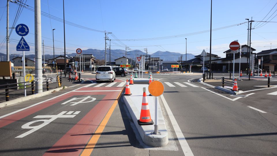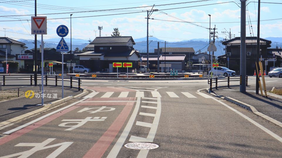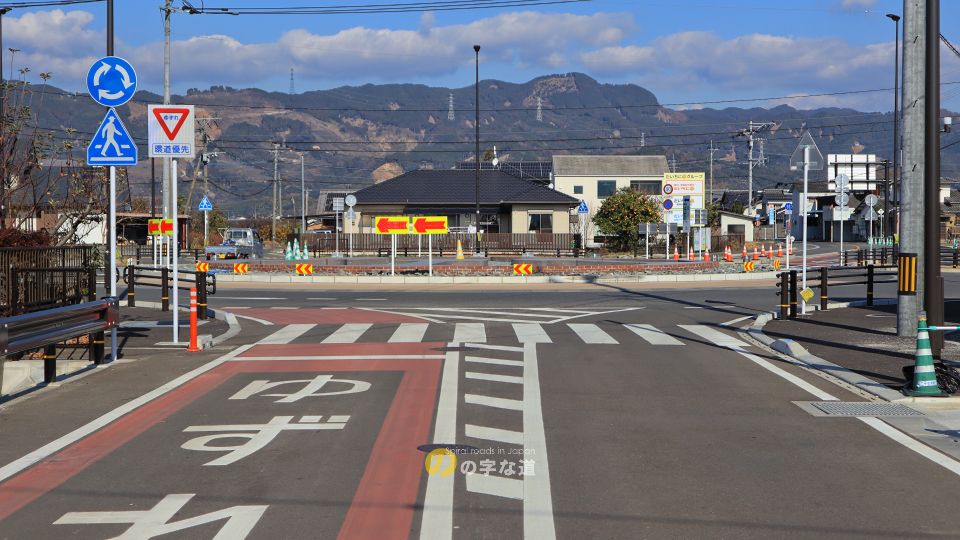規制標識「環状の交差点における右回り通行(327の10)」はラウンドアバウト供用開始に合わせて設置された。