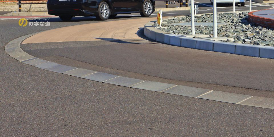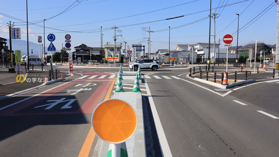 鋭角で交差する左の接続路へ流出する場合に大型車は環道を一周するよう案内することがあるが、ここは流出専用路が設けられている。交差点に面する家屋等を含めて大々的に配置を見直したからだろう。