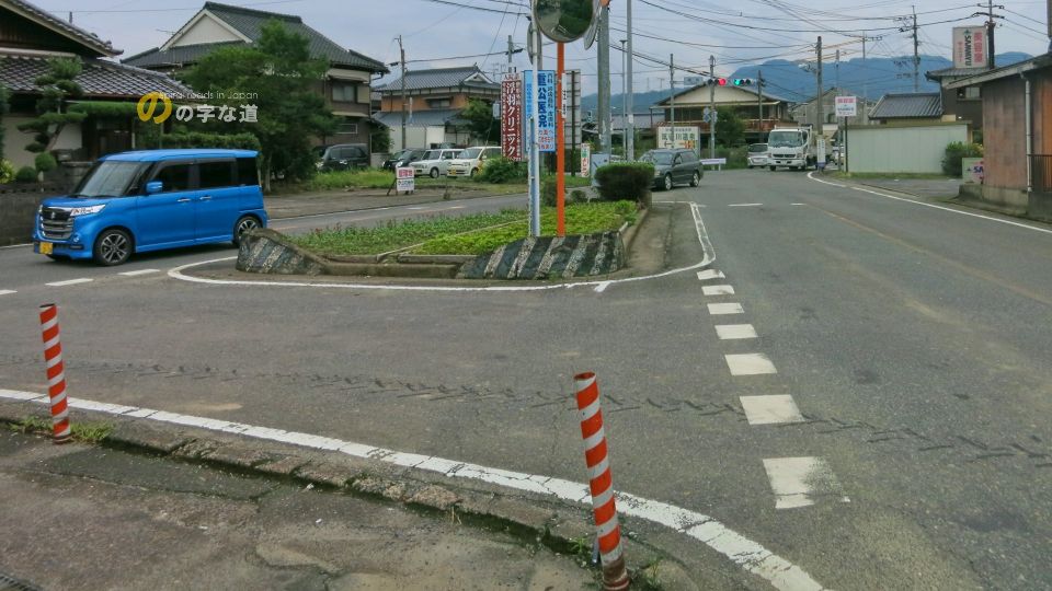 高見交差点を北側から眺める。この道路は市道で狭隘なためか、分離島がない。また、県道には警戒標識「ロータリーあり(201の2)」が設置されているが市道にはない。