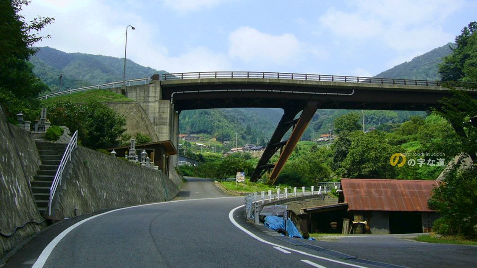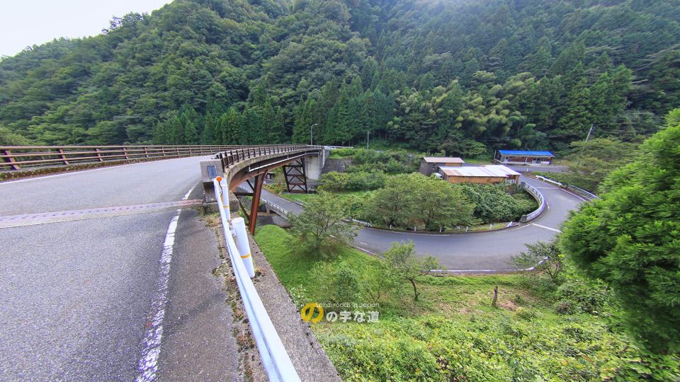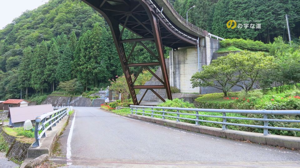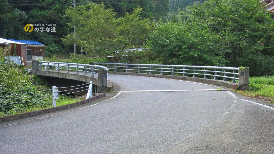 のの字を構成する橋は下から順に河原橋・花田橋・雲海大橋で、橋長70mの雲海大橋が村道自身を跨ぐ構造だ。