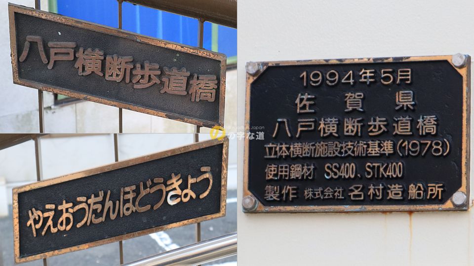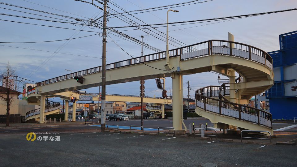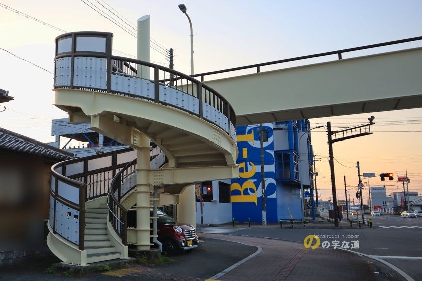 佐賀市の市街地西部、国道207号(貫通道路)と国道208号(環状西通り)の交差点(八戸交差点:やえ)に架かる横断歩道橋の昇降階段がループしている。