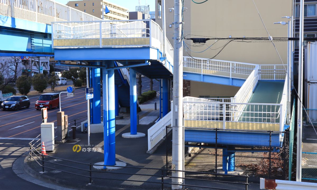 JR新横浜駅の南西1km、横浜環状2号の岸根交差点に架かる横断歩道橋の東側昇降階段が微妙にループしている。いや、カクカクしているから「ループ」はあまり適当ではないけれど。