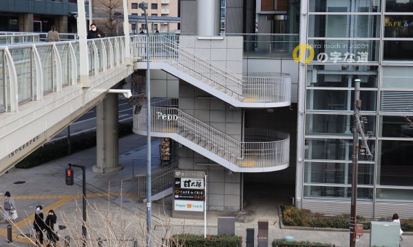 JR根岸線桜木町駅東口すぐ、桜木町駅前交差点に架かる横断歩道橋の昇降階段3つのうち2つが螺旋階段状になっている。当サイトのコレクションに加えるか少々微妙な物件だ。西側の富士ソフトビル隣接階段は1.5回転、東側のビル・クロスゲート隣接階段は1回転。
