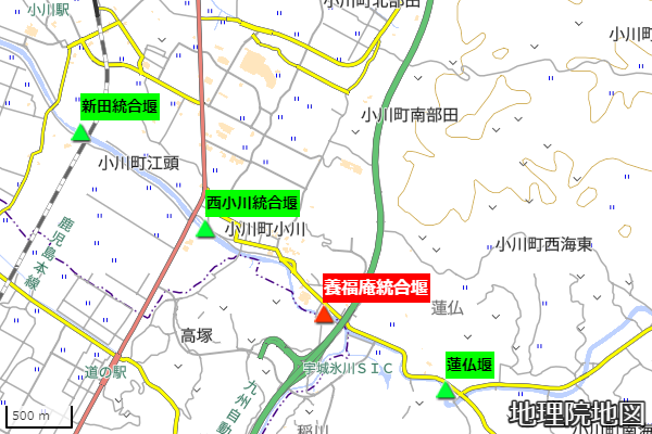 わずか3kmの間に4基の頭首工があるのはなかなかの密度である。なお、上に掲げた表の上住吉用水の頭首工はこの地図の外側(西側)にある。