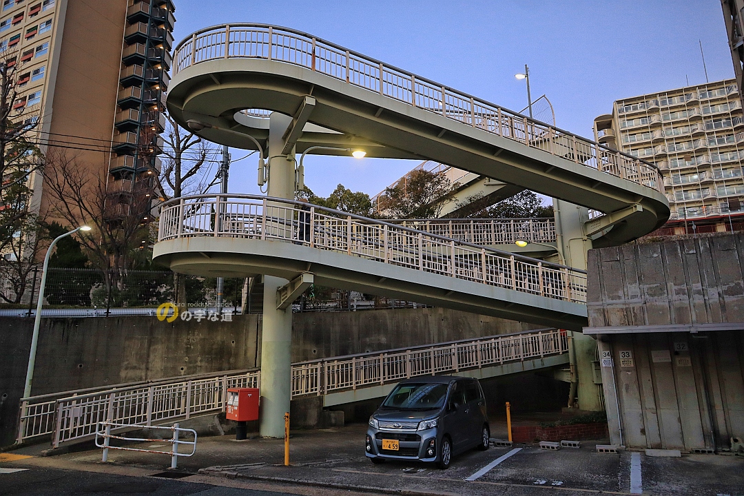 夢野ハイタウン2号棟の非常階段から夢野西歩道橋を俯瞰する。2号棟に住む人は2号棟に直接つながる連絡橋が欲しいと思っているだろう。
