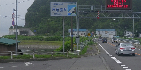目黒トンネルとえりも黄金トンネルの旧道区間は黄金道路の中でも路盤の位置が低くて荒波が直接押し寄せる場所で、波しぶきがかからない日はなかったのではないかと思うほど、激しい場所であった。写真は2008年に汐鳴覆道-オンコの沢第1覆道間(えりも黄金トンネルの旧道)で撮影。