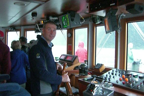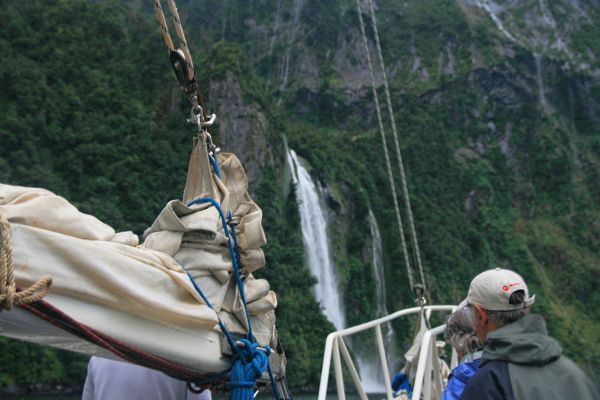 前日にもあったのだが、激しい水量の滝に船ごと突っ込んでいくアトラクションをやってくれる。これは落差146mのStirling Falls。デジイチを持った人たちはカメラを抱えてさっさと室内に避難。