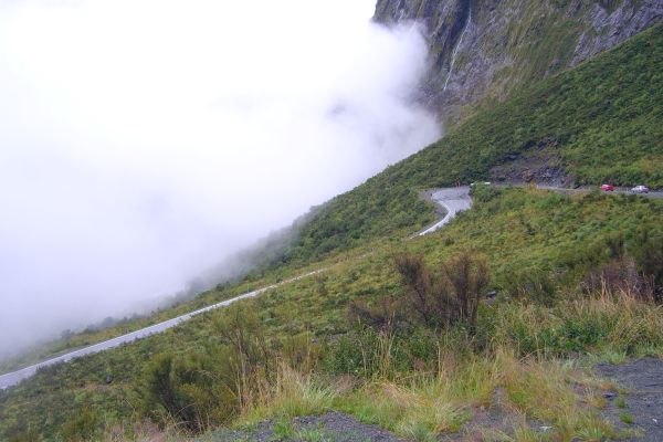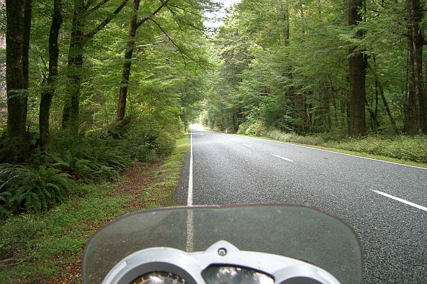 雨が降ったりやんだりの天気の中、行きに撮れなかった写真を撮りながらTe Anauを目指す。SH94のMilford Sound Highwayはこんな緑の中、そこそこの高速コーナーが多いワインディングロードなのだが、路面に浮く砂や木の枝が多くてとてもスピードを出せない。それに、この道を通るのは基本的に観光客ということもあってペースカーも多い。だから120kmなのに2時間かかるんだ。