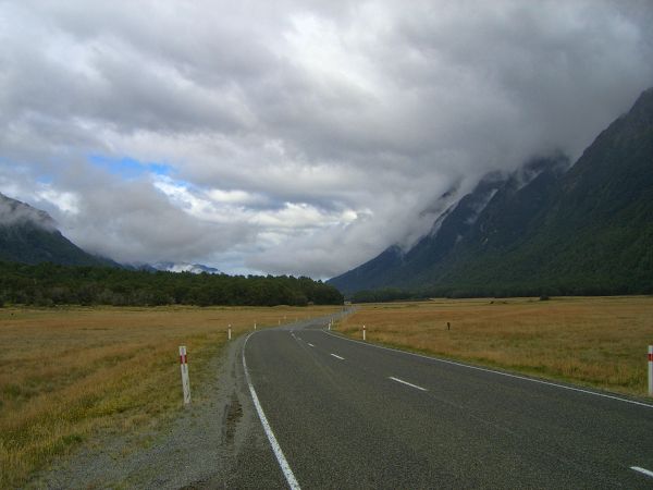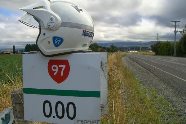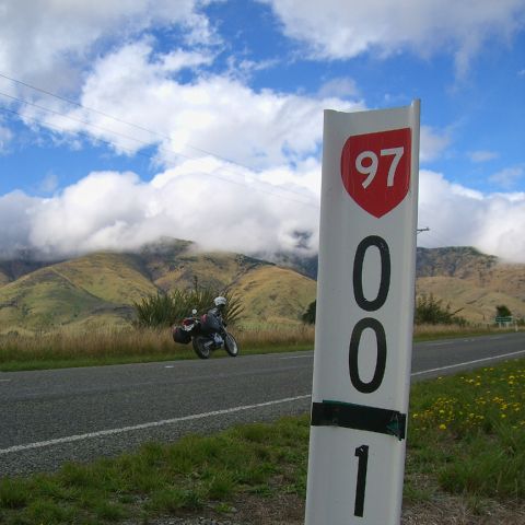 Queens Town方面に向かって淡々と走る。ニュージーランド産として有名なもののひとつに蜂蜜があって(入国検査で「持込禁止やからねっ!」と釘を刺された)、道を走っていると養蜂されていると思われるハチの群に出会うことがある。ハチがヘルメットのシールドに当たったときには・・・ナニがぶつかってきたの!?っていうぐらいに激しい衝撃、そして目の前に昆虫の体液がべっとり、と。