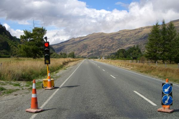 1車線しかない橋は、向こうとコッチのどちらがゆずるのか標識に書かれているが、ここQueens Townの入口、Kawarau Falls [Google Maps] では信号で制御していた。