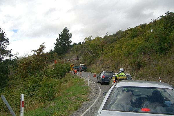 Arrow Junctionという町でSH6から離れて、Crown Range Roadに入っていく。絶壁の台地の上へ一気に駆け上がる道なので、結構な九十九折りだ。この奥にあるCardronaはスキー場が有名であるとともに、工事現場の兄ちゃんによれば、2000年に舗装が完了したことを機にQueens TownからWanakaへ抜ける道として交通量が格段に増えたらしい。なので、冬に向けてしっかり舗装工事をやっておこうということかな。