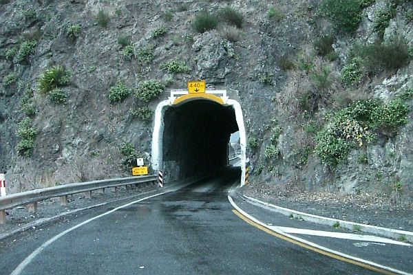 KaikouraからState Highway 1を10kmほど南へ走った場所にあるParititahi Tunnel [Google Maps]     にて。上下線各1本のトンネルで山側は近年に開削されたトンネルだが、写真のトンネルは古くから存在している模様。素掘りトンネルだが、後年にトラックの荷室形状に合わせてほんの少し削っただけの拡幅に刮目する。