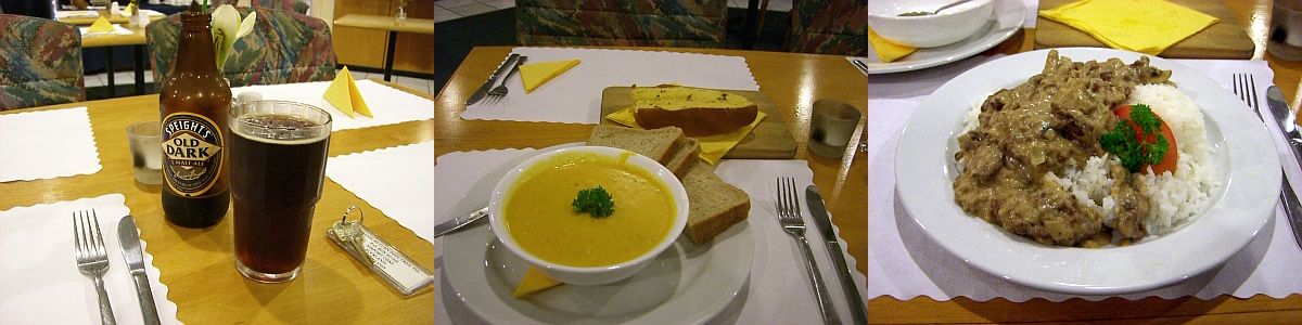 ヘロヘロになりつつ、シャワーだけ浴びて夕食へ。メニューにある食べたいものを適当にオーダーしていたら・・・写真のように炭水化物づくしになった。ビール3本、ポテトスープと食パン3枚、ガーリックトースト、そしてインディカ米山盛りのビーフストロガノフ。満腹でぐっすり眠れそうだ。