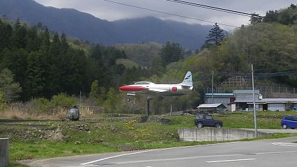 これは・・・T-33練習機らしきもの、なんだか識別できないヘリ、そしてなんと、Mirage 2000かF-104Jか知らないけど超音速系戦闘機が屋根に乗っかっているのである。なんでこんな山の中に!?