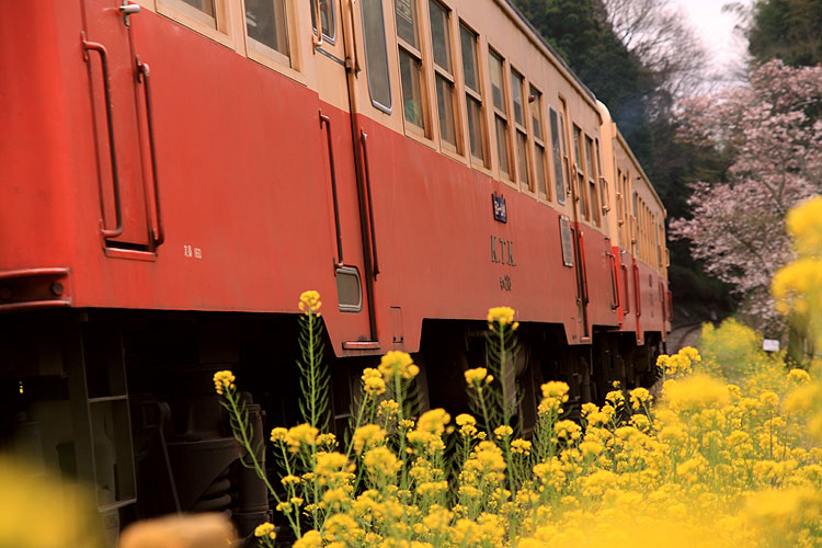 菜の花と桜の中を走る汽車って、絵になるじゃないですか。たぶんその程度のことかと。